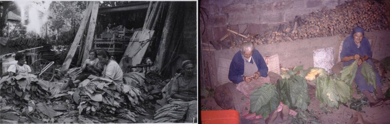 Sobald die großen Blätter erntereif waren, half die ganze Familie mit – oft auch Nachbarn und Verwandte. Jedes Blatt wurde vorsichtig gebrochen, um Risse zu vermeiden. Die frisch geernteten Blätter waren weich, feucht und klebrig.
